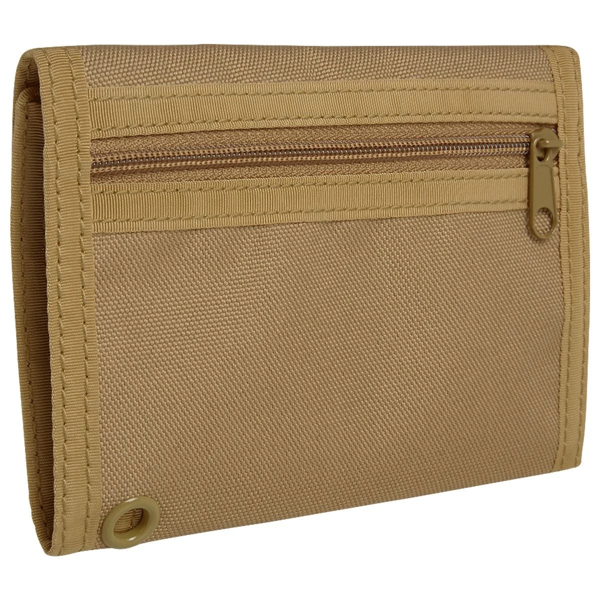 external coin compartment with zipper and a metal eyelet for attaching