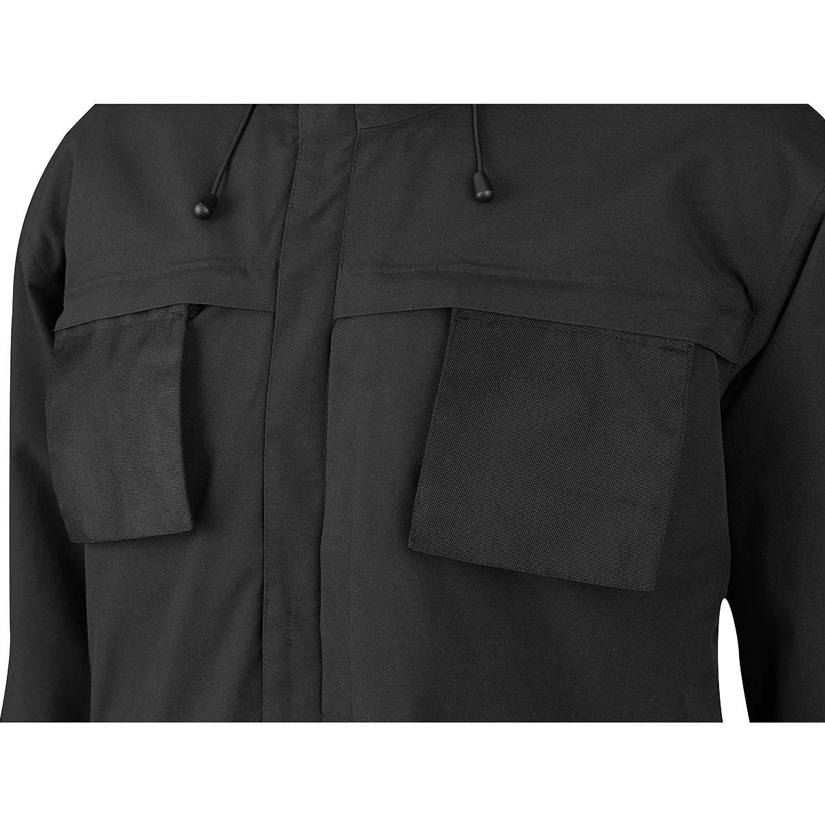 - Full front YKK two-way zip closure with hook-and-loop secured storm